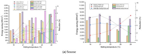 - The PCM melting temperature has an important role in energy savings. The best melting temperature was 21 °C, the closest to the set point temperature, which is 21 °C in winter. However, in lower semi-arid regions (Sousse), the melting temperature, which allows the highest reduction in energy need, was 29 °C.