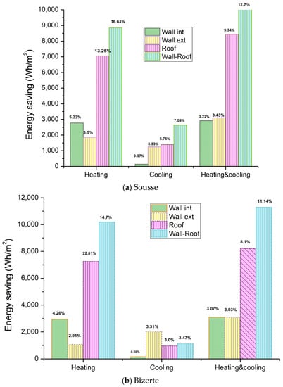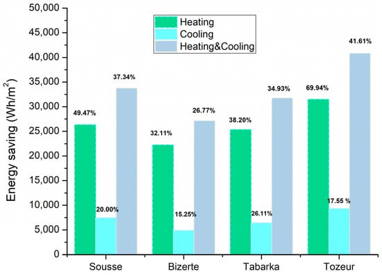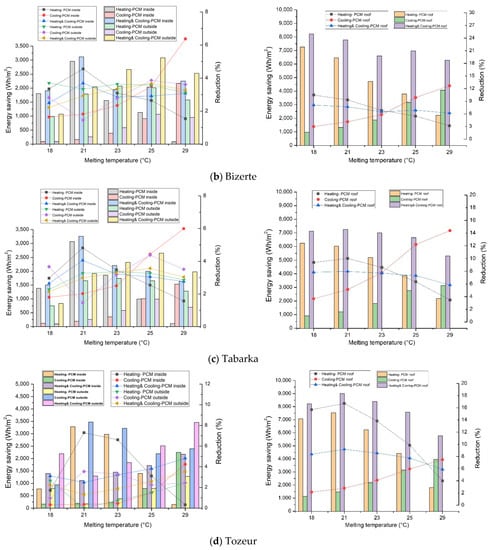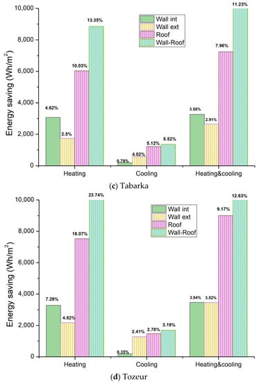 Utilization of PCM in different building envelope types was studied by integrating PCM in the roof, external or internal wall, and wall-roof of the building. In the wall-roof configuration, PCM21 is located in the interior surface of the wall, except in the Sousse region, where PCM29 is placed on the exterior surface of the wall. Moreover, PCM location was found to be an important parameter in the literature; therefore, two different locations, namely near the interior and near the exterior, were tested. The overall effect of these variables on the energy saving in heating, cooling, and total energy demand was then analyzed using the optimum melting temperature of PCM for each city. The obtained results related to optimal envelope type, location, and configuration are given in Figure 7.