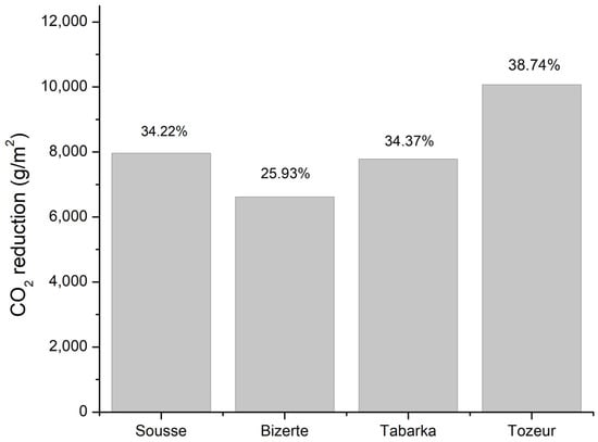 As shown previously, the optimal conditions for minimizing the heating and cooling energy requirement vary from one climatic region (city) to another. Therefore, in this section, the energy conserved with these optimized cases for each respective region was calculated and the corresponding CO2 emission reductions were revealed. The optimum melting temperature for each city was selected; the PCM was located at the best location, and the 40 mm PCM thickness was taken. It was seen that a significant reduction in heating, cooling, and total energy needs can be attained with the optimized integration of PCM. For instance, the total energy need reduction (heating and cooling) reached a value of 37.34%, 26.77%, 34.37%, and 41.61% for Sousse, Bizerte, Tabarka, and Tozeur, respectively (Figure 9). As a result of these reductions in the energy requirement of the building for heating and cooling applications, a considerable amount of CO2 emission reductions were achieved, corresponding to 34.22%, 25.93%, 34.37%, and 38.74% for Sousse, Bizerte, Tabarka, and Tozeur, respectively (Figure 10). Consequently, the PCM integration with optimized parameters such as melting point, location, and thickness can significantly contribute to energy savings as well as a reduction in CO2 emissions.