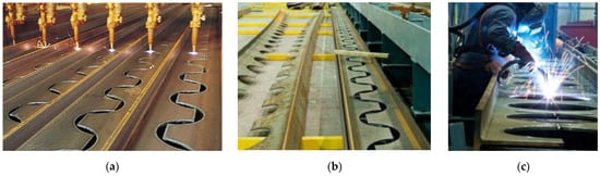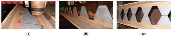 Cellular beams manufacturing process [,]: (a) Cutting; (b) Parting; (c) Welding.