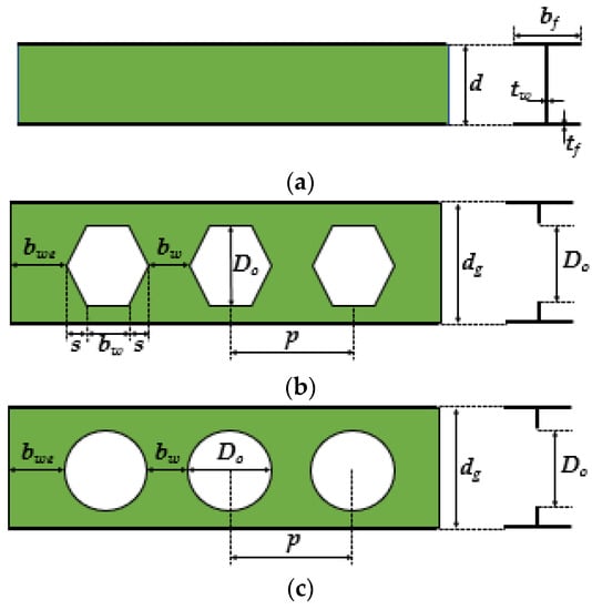 Geometric parameters of alveolar beams: (a) Parent; (b) Castellated; (c) Cellular section. bf = flange width; bw = web-post width; bwe = end-post width; D0 = opening depth or diameter; d = parent section depth; dg = alveolar beam depth; p = length between the opening diameter centers; s = length of the hexagonal opening diagonal edge; tf = flange thickness; tw = web thickness.