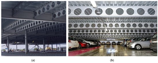 Applications of composite alveolar beams []: (a) With castellated section; (b) With cellular section.
