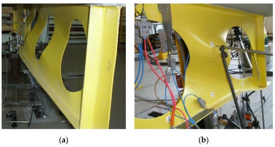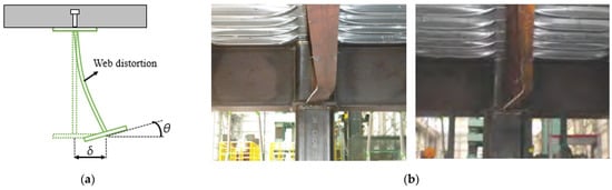 The steel I-section is compressed in hogging moment regions of steel-concrete composite beams, and the concrete slab is tensioned []. Due to this, these beams can reach failure by lateral distortional buckling (LDB), an instability mode characterized by a lateral displacement and rotation of the lower flange accompanied by web distortion (Figure 5a) []. Since the steel profile is subjected to compressive stress, the lower flange tends to move laterally out of the bending plane. When the profile web does not have enough flexural stiffness to contain this lower flange lateral displacement, the LDB can occur [], as shown in Figure 5b. The LDB behavior of the steel-concrete composite beams without web openings was considerably investigated. Elastic numerical analyses [,,,,,], inelastic numerical analyses [,,,,,,,,], and experimental tests [,,,,,,,,] were conducted. In addition to LDB, web local buckling has also been addressed by experimental and numerical investigations [,,,,]. Additionally, studies have assessed ways to improve the cracking of the concrete slab of these beams, such as the use of high-performance concrete (HPC) [], ultra-high-performance concrete (UHPC) [,,], engineered cementitious composite (ECC) [,], prestressed concrete slabs [], and carbon fiber-reinforced polymer (CFRP) []. Other issues, such as the shear interaction steel beam-concrete slab [,,], beam-to-column joints [], and residual deflections [], have also been studied for the beams in question.