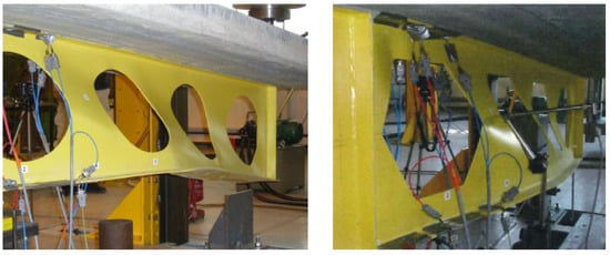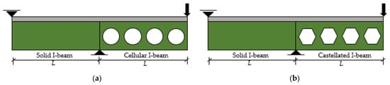 The considerable gain in the resistant capacity of the floor system justifies the use of alveolar profiles in steel-concrete composite beams. Thus, these beams can be designed to cover spans from 12 to 20 m [,]. However, the behavior of steel alveolar beams becomes more complex than steel profiles without sequential web openings []. Alveolar profiles are susceptible to different types of buckling modes or their interaction [,,]. The increase in the composite alveolar beam resistance over non-composite beams is more evident in long spans []. Figure 4a,b show examples of composite castellated and cellular beams with steel deck slab, respectively.