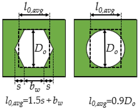 The standard procedures presented in this section do not address the LDB verification on continuous steel-concrete composite beams with web openings. However, some authors give adaptations of these standards [,,]. In addition, assessments on the lateral-torsional buckling behavior of steel cellular beams show that the methodologies developed for solid I-beams can be adapted to cellular I-beams, which must determine the cross-section geometric properties in the central region of the openings, the so-called double T section [,,,,]. On the other hand, Sonck and Belis [,] recommend that the torsional constant (J) must be obtained by an average (J2T,Average) between the J of the I-section (Jsolid) and the J of the double T section (J2T) obtained through Equation (1), where the parameters are: number of openings (n), equivalent opening length for the adapted torsion constant (l0,avg), and I-section unrestrained length (L). The opening equivalent length (l0,avg) for the castellated and cellular I-sections are determined as shown in Figure 7 [,].