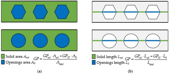 Other approaches were presented by Carvalho, Rossi, and Martins [], which cover different methods in the determination of geometric properties: without web openings (solid section); the calculation of properties at the center of the opening (double T); and three approaches using average values between the properties of the solid section and the double T section, the so-called “average section”, “linear weighting section”, and “superficial weighting section”. The mean value between the properties is used in the “average section”. In addition, the weighting of the values, the total length of the web post, and the total length of the openings, are utilized in the “linear weighting section”. Finally, the weighting of the values, the total area of steel in the web, and the total area of the web openings, are adopted in the “superficial weighting section”. The last two approaches are detailed in Figure 8, where the parameters are: arbitrary geometric property (GP), arbitrary geometric property calculated at plain section web (GPsol), and the arbitrary geometric property calculated at the middle of the opening (double T section).