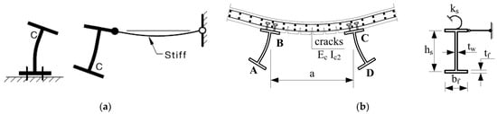 The European standard (EN 1994-1-1: 2004 []) and Brazilian standard (ABNT NBR 8800: 2008 []) use the inverted U-frame model to determine the elastic critical moment to LDB (Mcr). The U-frame model (Figure 9b) considers the composite beam cross-section as an I-section with its upper flange with lateral displacement completely prevented and rotation partially prevented by a rotational stiffness spring (ks). The rotational stiffness ks, given by Equation (2), is composed of the bending stiffness of the slab (k1, Equation (3)) per unit of beam length and the bending stiffness of the web I-section (k2, Equation (4)):