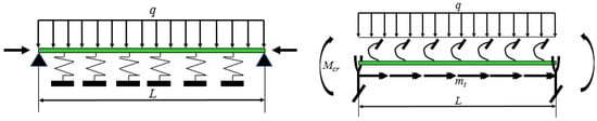 According to Rossi et al. [], the LDB research methods for the elastic critical moment determination generally fall into two categories: studies based on the energy method (Galerkin method) or those based on the elastic foundation-beams theory. The formulations of Roik et al. [] and Dias et al. [] are within the methodologies developed using the energy method as well as the propositions of Svensson [] and Williams and Jemah []. On the other hand, Hanswille et al. [] utilized the elastic foundation-beams theory in their prediction procedure. The methods in question are objectively described below.