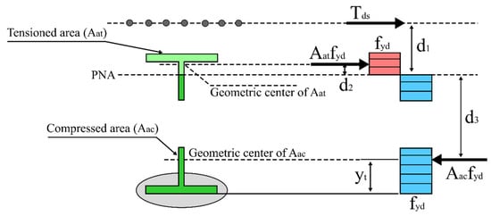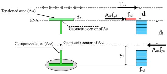 As the PNA position is on the web, the steel I-section’s tensioned area (Aat) and compressed area (Aac) are defined as presented in Equations (33) and (34), respectively.