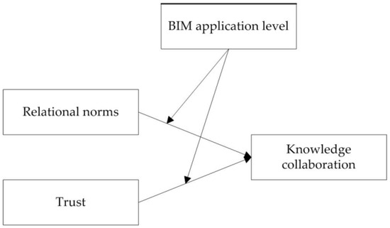 BIM application enhances collaboration and communication efficiency, which helps to reduce misunderstandings and conflicts [49]. BIM allows project parties to easily access their required knowledge and information, thus reducing information asymmetry between project teams and decreasing project uncertainty and risk [50]. Gao et al. (2022) argued that consistency of the data format enables project parties to effectively curb the development of “information islands”, immediately share information, decrease opportunism, and motivate them to collaborate [51]. Therefore, when the BIM application level is higher, the trust mechanism may be more efficient in improving knowledge collaboration. Previous scholars have confirmed that BIM application benefits project party collaboration [43,44]. In this case, the application of BIM technology desires implementation strategies to ensure that each project party can execute their responsibilities [40,52]. Consequently, BIM can be a helpful management approach that influences knowledge management and collaborative performance. Hence, we hypothesize: