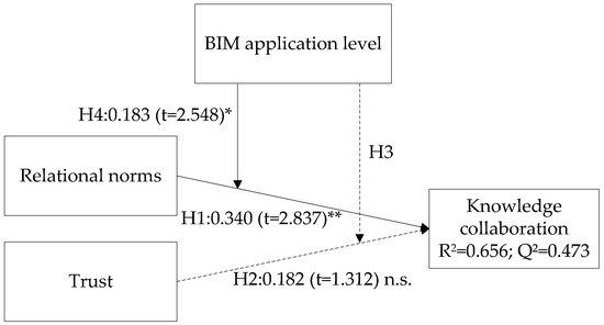 This study developed a full PLS-SEM structural model to test the hypotheses regarding the relationship among relational norms, trust, BIM application, and knowledge collaboration. This study adopted the coefficient of determination R2 for the endogenous constructs to test the structural model, and cross-validated redundancy measure Q2 to examine the predictive relevance of the structural model. Figure 2 shows that the R2 value is 0.656 and above 0.50 values [60]. Meanwhile, as displayed in Figure 2, the Q2 values of the endogenous constructs are greater than 0, thus declaring that the predictive relevance of the model is appropriate [58].