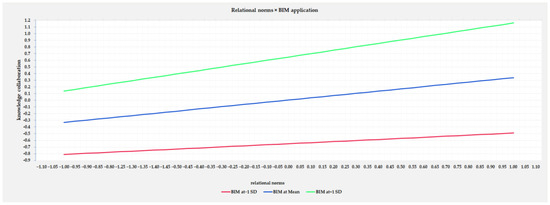 Following Hair et al. (2013) [57], the significance of the path coefficients was calculated through a bootstrapping approach with 166 cases and 5000 subsamples. Figure 2 shows that relational norms strongly influence knowledge collaboration (H1: β = 0.340; t = 2.837; p < 0.01), and thus H1 is supported. However, H2 is rejected because the effect of trust on knowledge collaboration is insignificant (H2: β = 0.182; t = 1.312; p = 0.189). Next, the moderating effect of BIM application level is tested. The moderating results reveal that H4 is supported (H4: β = 0.183; t = 2.548; p < 0.05), whereas H3 is not supported because of the unsupported H2 [61]. Furthermore, this study conducted a sample slope analysis to examine the moderating effect. As a result, three slopes were plotted according to the level of BIM application (at the mean, one standard deviation below the mean, and one standard deviation above the mean). As shown in Figure 3, the positive effect of relational norms on knowledge collaboration is stronger when the BIM application level is high than when it is weak. Therefore, H4 is supported.