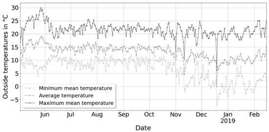 Daily outdoor temperatures in Toluca from May 2018 to February 2019. Light grey represents the minimum, mid-grey the average, and dark grey the maximum.