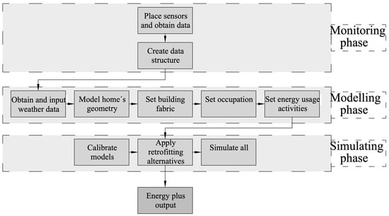 Stages of the simulation process. Stage 1 (monitoring phase) consisted of obtaining the sensors, ensuring their correct operation, and placement in the different houses. Stage 2 (modelling phase) surveyed the homes (measuring the perimeters and taking photographs). Later, these data were used in D.B. to create the simulation models. Finally, Stage 3 (simulation stage) consisted of simulations with the different building envelopes.