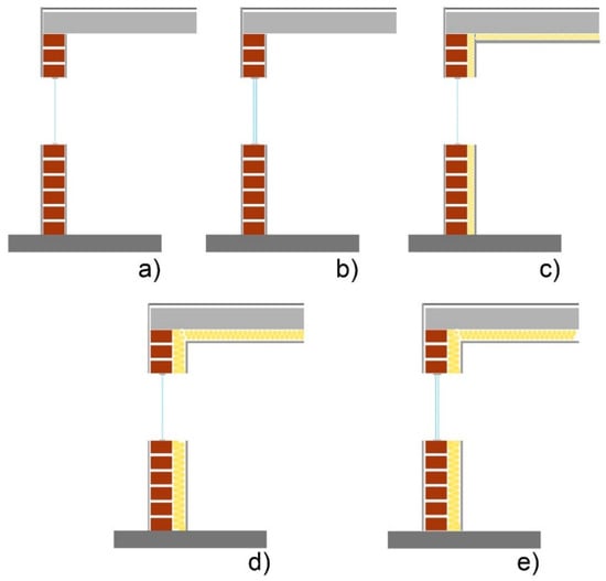 Section drawings of the different building fabric typologies used in the dynamic simulations. Each cross-section is explained below identified by its letter: (a) as built; (b) double glazing, no insulation; (c) single glazing and 3 cm of insulation (as established by the NOM-ENER-020); (d) single glazing and 5 cm of insulation (standard practice); (e) double glazing and 5 cm of insulation.