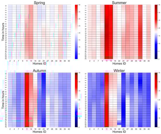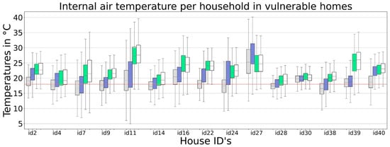 The calibration of a computer model to real data is one of the most complex steps of a simulation study []. It compares the real data collected to the simulation results, proving the validity of the computer model for further studies and applications related to improving house thermal behaviour and energy conservation measures []. One of the most accepted calibration techniques is to compare real monitored hourly data against the simulated data []. The magnitude of the difference is evaluated with mean bias error (MBE) and the coefficient of variation of the root mean square error (RMSE). A model is considered calibrated if these values are not above 25% (MBE) and 35% (RMSE), according to ASHRAE guideline 14 []. Table 8 shows the MBE and RMSE values for the different calibrations undertaken. The mean value for MBE is 12.5 (sd = 3.6), and for RMSE is 15.2 (sd = 3.5). None exceeds the threshold values set by ASHRAE. A graphical check shows the comparisons in line and box graphs per hour as seen in Appendix A.