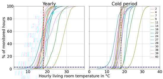 The WHO has established that a temperature range between 18 °C and 24 °C presents no risk to human health during sedentary activities in indoor spaces []. Although existing literature [] and standards [] confirm that the upper threshold may vary depending on other variables, such as the outside temperature, many studies have agreed on the lower threshold of 18 °C [,,], and even 20 °C for spaces occupied by vulnerable groups [], for naturally ventilated buildings.