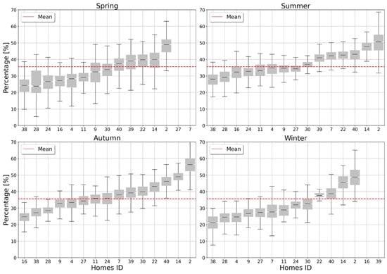 The results in this section were also scalar, ranging from extremely difficult to very easy, as seen in Table 6. A single home/respondent could obtain a maximum of 45 points for their answers to these nine questions (i.e., if its answers were all “very easy” in the nine questions). Thus, first we obtained the total score per home or respondent in each season by adding the values of each of these questions into a single score per home or respondent. Afterwards, we calculated the mean of these values for each home or respondent, obtaining the “average physical self-perception score”.