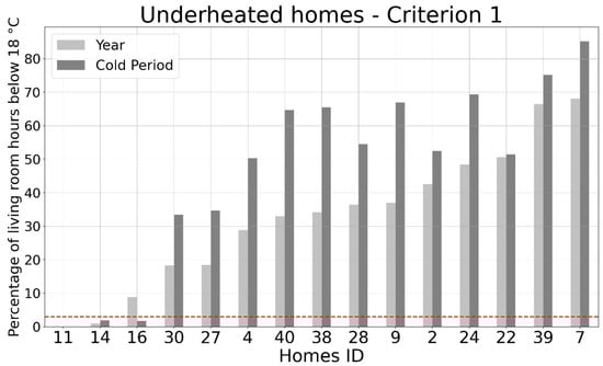 Criterion 2 assesses the severity of underheating. It is well established that exposure to temperatures below 18 °C damages the health of the occupant; however, the lower the operating temperature, the more damage. For example, Saeki et al. [] found that the blood pressure of the adult population in their study worsened when the temperature dropped by one Centigrade degree. In addition, Shiue et al. [] found a risk of high blood pressure rises when subjects spent time at temperatures below 16 °C. In addition, a house exposed to temperatures below 14 °C encourages mould growth, affecting the health of its occupants []. Hence, we deemed it necessary to evaluate the severity of underheating in the homes in this study. Criterion 2 uses a metric based on the heating degree day (HDD) []. This metric is used as a proxy to calculate the energy needed to heat a space. The HDD formula is: