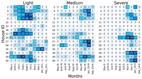 Results of the underheating criteria 2 applied to the calibrated models. The X axis shows the months, and Y axis shows the house ID. The intersection of both shows the number of underheated light (left), medium (middle), and severe (right) days in that month.