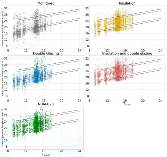 where is the average external dry bulb temperature []. Further, the adaptive graph requires the operative temperature on the Y-axis. Our sensors only recorded dry bulb air temperature . As in indoor spaces there are minor differences between radiant and air temperatures [], and many studies have assumed that is a good proxy to [,]. Hence, the results in this article should be read as = .