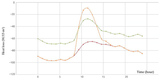 Example of simulated course of airflow from interior to exterior and their comparison as of 21 January 2022 for dimension of a southeast façade strip of 15 m height and 1 bm width. Façade with traditional contact insulation system (green), façade without air flow control through a ventilated gap (red) and smart façade with airflow control through a ventilated gap (orange).