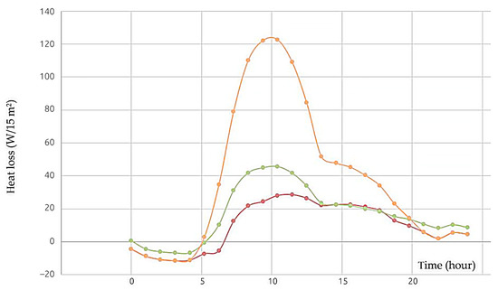 Figure 5 shows an obvious impact of natural airflow through the air gap and its crucial impact on the heat flow value (heat loss) of a given façade. Heat flow through a wall with a standard insulation system (green), heat flow through standard cladding with a free air gap (red), and a new cladding system with controlled air flow through an air gap (orange, the flow is limited to the minimum, only flow through leaks in joints of the structure and cladding composition). In the research project of TACR (TACR project is a project funded and monitored by the Technology Agency of the Czech Republic, https://www.tacr.cz/en/technology-agency-of-the-czech-republic/ (accessed on 28 February 2023)), this issue is extensively investigated and potential real technological measures to improve the energy effectiveness of façade systems with a ventilated gap are examined and analyzed.