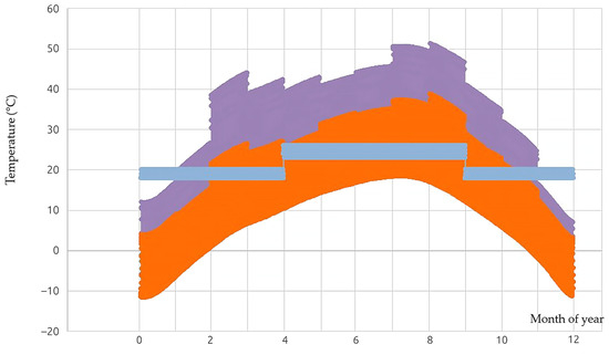 Figure 7 presents an example of a preview of selected courses of calculated quantities over the whole year. Figure 7 shows the value that the inlet air from the air gap may reach in the summer season for a given examined southeastern part of the façade in extreme summer conditions of up to 39 °C at 10 a.m. with the exterior air temperature of +32 °C. In the winter season on sunny days, the temperature of air coming out of the air gap may reach values of 0 °C (exterior air temperature of −10 °C), which is not only caused by solar radiation, but also by the heat loss, or by heat increment from the building interior. Therefore, it is advisable to apply systems of controlling airflow through the air gap (as mentioned above).