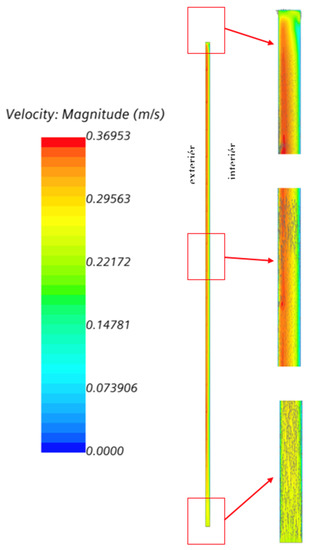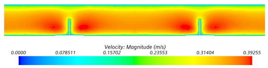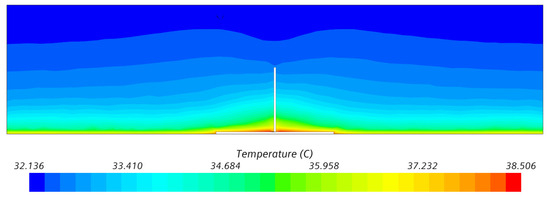 Based on analytical calculations in the FSVM environment (http://fasady-5034.rostiapp.cz/ (accessed on 28 February 2023)), the day of 21 July 2022 was chosen for the summer extreme. The visualization of streamlines in the ventilated gap and of the temperature field in a vertical cross-section of the façade in the summer temperature extreme is shown in Figure 8.