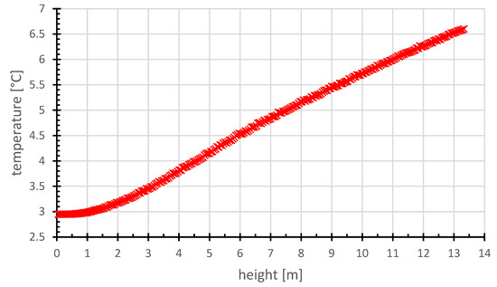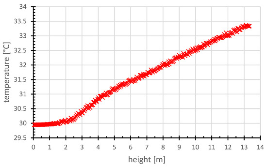 Figure 10 shows the temperature distribution of air in the air gap along the façade height in the summer extreme, with noticeable linear growth of air temperature along the façade height. Only the air at the façade bottom heats up slower. This is caused both by the proximity of the sucking of exterior cooler air and by the location of the measuring points in the center (axis) of the air gap.
