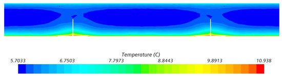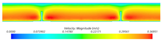 It is clear from the figure that the highest velocity of airflow is at the highest point and in the outlet of the airflow from the ventilated gap. This is caused by natural air buoyancy and its heating over the external façade envelope along its whole height. The highest air temperature in the air gap is in the highest point of the façade. In addition, there is a noticeable impact of the temperature of the cladding-bearing structure and the shape of the angles bearing this cladding. At the spots of the bearing angles, the air temperature in the air gap increases in comparison to the remaining gap area. In addition, due to the airflow around this warm structure, the airflow in the ventilated gap shows local acceleration.