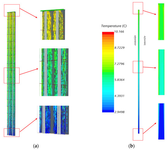 (a) Visualization of streamlines in ventilated gap of façade—3D view. (b) Visualization of temperature field in façade vertical cross section in winter temperature extreme.