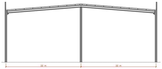 The studied industrial shed in question is formed by a set of 11 frames spaced every 12 m, with internal frames composed of three rectangular columns and two beams with an I cross-section spanning 22 m, as shown in