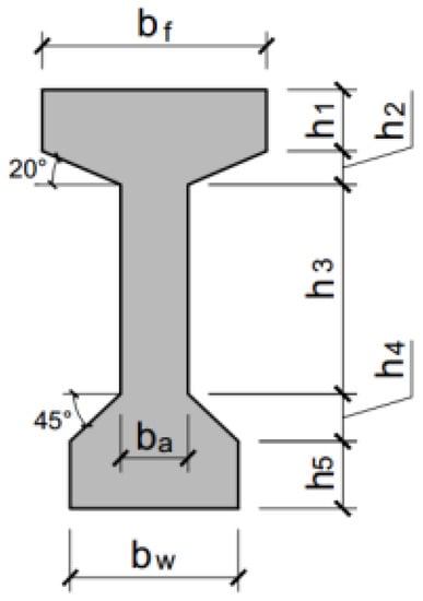 The same loads used in the real project were considered in calculating the forces acting on the beams. The permanent loads due to the own weight of precast elements (beam and purlins); the permanent load due to the own weight of the metallic tile (0.11 kN/m2); a permanent overload of 0.05 kN/m2 representing equipment permanently fixed to the roof (lighting, sprinklers, and others.); and an accidental overload of 0.25 kN/m2. It is noteworthy that the beam’s own weight was calculated within the Genetic Algorithm routine after defining the geometric characteristics of the beams.