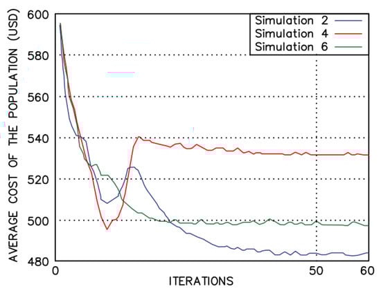 16]. Analyzing the results, it was possible to notice that the GA was not able to converge to a single solution and that the price difference between the two extremes was significant, USD 83.98. This possibly occurred due to the strong influence of the variables on the final result; and due to the assumed GA parameter configuration. The graph representing the average value of the Fitness Function of the individuals at each iteration of Simulations 2-1, 4-1, and 6-1 was plotted in