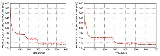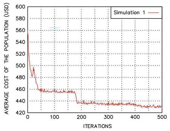 To finalize and confirm whether it would be possible to find more economical solutions than the one found in simulations 1-2, new simulations were performed with the same parameter settings; however, setting 600 and 700 iterations as a stopping criterion. Even providing the GA with more time to escape local optimal points, the results were similar to those of the simulations with 500 iterations, as seen in