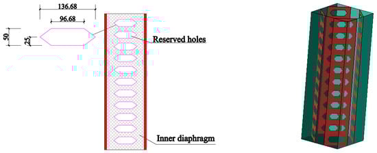 CFSF5 and CFSF6 were designed with different section forms to investigate whether a thinner steel formwork can realize the design idea. Additionally, this section form reduced the number of welds, lowering the cost. For inner diaphragms, in order to achieve the above design goal, in theory, the inner diaphragm should be connected to the steel formwork by full welding. However, when connecting the spaces in the column separated by the inner diaphragm, holes are arranged along the fixed spacing of the inner diaphragm, the purpose of the opening is to connect the concrete in different partition intervals during concrete pouring construction and to reduce concrete defects. It conveniently embeds internal diaphragms in concrete and reduces the slip between them, thus effectively forming an integral whole.