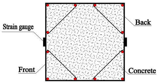 In order to measure the axial compression deformation of a specimen in the test process, two longitudinal and transverse strain gauges were uniformly arranged at the two interfacial positions of the steel formwork, thus measuring the strain development of the specimen during axial compression, as shown in Figure 3.