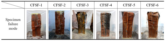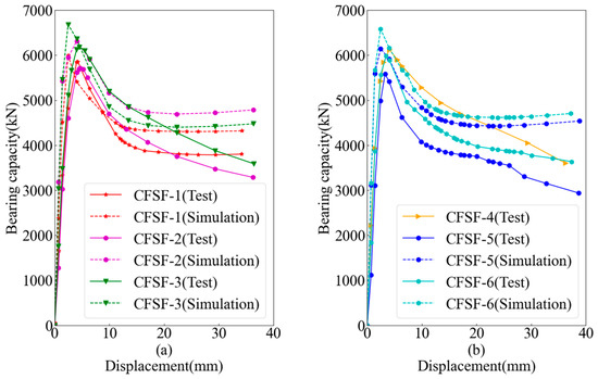 As seen in Figure 10b, the bearing capacity of CFSF-6 is higher than that of CFSF-5, and the simulation and test results are consistent. However, the difference in the ultimate bearing capacity between CFSF-6 and CFSF-5 was smaller in simulation results, which reflects the effect of fabrication errors on test results.