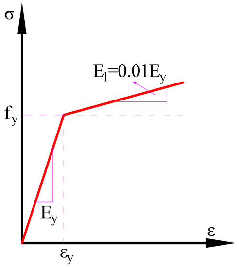 This study adopted the double broken line model for rebars, with a hardening coefficient of 0.01, as shown in Figure 6. The stress-strain curve after yield was simplified into an oblique straight line according to the Mises yield criterion. (See the material parameters of rebars in Table 5.)