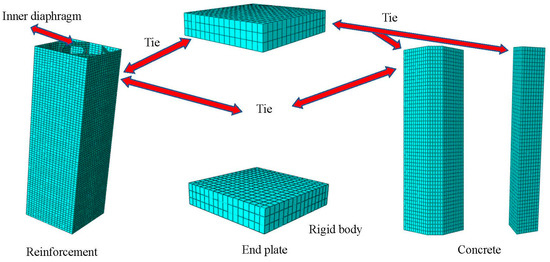 The components in the numerical simulation were set as follows in combination with the test components: concrete was modeled using C3D8R elements; longitudinal rebars were modeled using T3D2 Truss elements; and steel formworks and internal diaphragms were modeled using S4R shell elements. A tie connection was set between the concrete and steel formworks/inner diaphragms at the edge and in the core area; the tie connection mode makes the two faces connected together no longer separate and makes them deform together, which can reflect the ability of the two to work together. The embedding connection was used between the concrete and rebars. The column top was defined using a set of nodes, while the column bottom was fully fixed to confine six directional degrees of freedom (DOFs). Moreover, the displacements in the x and y directions and the rotational DOF in the z direction of the rebars were confined. The steel formwork, the concrete, the end plate, and the bar were divided into grids, and the steel formwork and the inner diaphragm board were made into a whole by merging, so as to arrange the bars. The inner diaphragm can be divided into several quadrangles by an extension surface, which can be divided into structured meshes. The advantages of this method include fast mesh generation, high quality, and increased proximity to the actual model. Loading was applied using displacement loading, as shown in Figure 7.