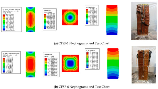 Figure 8 shows the simulation nephograms corresponding to the test results. (See the CFSF-1 cavity column in Figure 8a and CFSF-6 in Figure 8b). It can be seen that the maximum strain position of the finite element model is the same as that in the tests, that is, located in the middle of the column. This suggests that the finite element model can well reflect the buckling deformation of specimens. The edge concrete at the upper end of the column broke during the test process. This phenomenon can be compared to the compressive damage DAMAGEC of the finite element model, which reflects the damage (often within the range of 0–1) to concrete under compression. Generally, a value above 0.9 means the concrete has completely broken [32]. As seen from Figure 8a, the concrete damage in the finite element model exceeded 0.9, indicating that the failure mode of concrete in the numerical simulation is consistent with the test results. The position with the largest displacement, observed from the displacement nephogram, is located at the column top. The test diagram shows that deformation and damage are concentrated in the upper and middle parts of the column, while the lower and middle parts are free from deformation and damage, indicating good agreement between the simulation and test results. However, the upper steel formwork of CFSF-1 is not as seriously damaged as CFSF-6. This is because the steel formwork of CFSF-1 was designed with a larger wall thickness and consequently possessed a stronger ability to confine and deform.