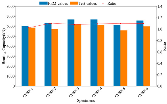 The ultimate bearing capacity results of specimens were obtained from the tests and the numerical simulation, and histograms were drawn for comparison, as shown in Figure 9. It can be seen that the ratio between the simulation and test results is around 1. Error calculation yielded a gap of 2–10%, pointing to material defects and human factors. The bearing capacity of CFSF-1 is about 2.4% higher than that of CFSF-2. CFSF-1 used rebars with an angular diameter of 16 mm and internal diaphragms with a thickness of 1.8 mm. At the same time, CFSF-2 adopted rebars with an angular diameter of 20 mm and internal diaphragms with a thickness of 1.2 mm, which indicated that the influence of corner bar diameter on bearing capacity is lower than the thickness of inner diaphragm. When comparing CFSF-5 and CFSF-6 in a similar scenario, the ultimate bearing capacity of CFSF-6 was 6.7% higher than that of CFSF-5. Clearly, it can be seen that the thickness of the inner diaphragm has a more obvious effect on the bearing capacity of both forms. Taken together, the figure suggests that the constitutive relationship of the material is close to reality and that the numerical simulation results are desirable.