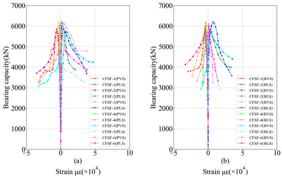 The strain values of the specimens were obtained using the longitudinal and transverse strain gauges on the front and back of the steel formwork and then combined with the loading results to draw the load–strain curves, as shown in Figure 11 (where “PVS” denotes the front longitudinal strain, “PLS” denotes the front transverse strain, “BVS” denotes the back longitudinal strain, and “BLS” denotes the back transverse strain). In the initial loading stage, all strains increased linearly. With the increase in load, the strain of the external steel formwork gradually reached the yield strain. Almost all measured strains were more significant than the yield strain limit until the load increased to the limit and the slope of the curve decreased. The above results indicate that core concrete has an effective supporting effect on steel formworks and improves the bearing capacity of specimens. The differences between transverse and longitudinal strains on the front and back of the steel formwork were small. Overall, a comparison between the two types of design forms revealed that the deformability and ductility of Figure 1a were better after reaching the ultimate bearing capacity. A possible reason for this is that concrete expands due to axial compression when the load exceeds the ultimate load. In the design form of Figure 1a, core concrete is in contact with the steel formwork, which enhances the interaction between the two materials.