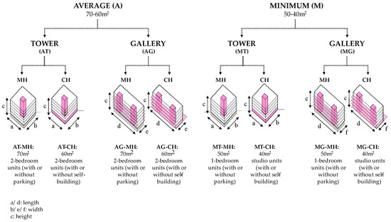 Figure 1 illustrates the different design solutions or scenarios applied in the simulation, and informs how findings are organised and presented. First, we chose two unit types to cover two plausible options when providing affordable housing designs: a more average (A) or family-type, which corresponds to a 2-bedroom unit (70 m2 in MH, and 60 m2 in CH); and a minimum type (M), a 1-bedroom/studio unit. The 1-bedroom unit type in MH has 50 m2; the studio in CH has 40 m2. At the same time, we selected two distinct residential building typologies, the tower (T) with one circulation core (with lift and staircase) and the gallery (G) with two circulation cores. We then assigned a typology to each unit type to end up with four ‘categories’ to be applied to MH and CH: the average-tower (AT), the average-gallery (AG), the minimum-tower (MT), and the minimum-gallery (MG).