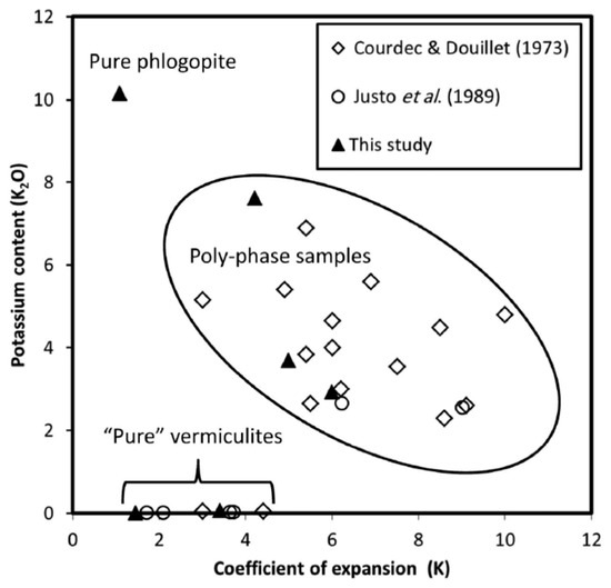 Figure 3 reports the potassium (K2O) contents and the expansion rate of vermiculites (K) from different authors, and it is observed that “Pure vermiculites” present a low potassium content and low expansion rate, but vermiculites with more than one constituent phase (polyphase samples) present a higher expansion rate. It is concluded that for vermiculite flake to have a higher expansion rate, it should present potassium contents between 3% and 5%; this range means that there are mica and/or hydrobiotite phases in the material.