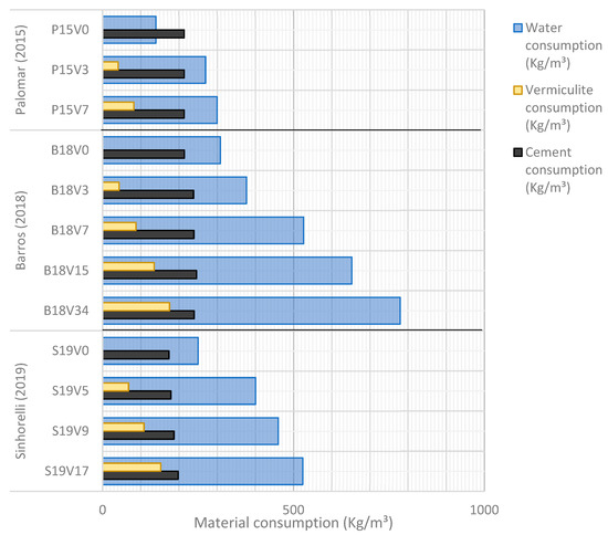 Figure 5. Correlation of water, cement, and vermiculite consumption [17,43,44].