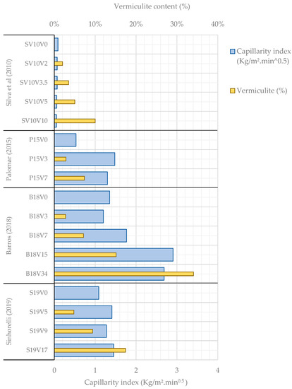 From Barros [17] and Sinhorelli’s [44] studies, it is notable that the cement consumption increased as the vermiculite content increased. The binder increasing was due to maintaining the same mortar volume. When the cement and vermiculite content in the mixes studied by Barros [17] increased, the water consumption also increased from 308.8 kg/m3 (B18V0) to 377 kg/m3 (B18V3), 526.8 kg/m3 (B18V7), 652.9 kg/m3 (B18V15), and 779.7 kg/m3 (B18V34). These values represented increases of 22%, 70%, 111%, and 152%, respectively.