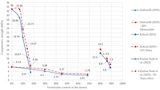 Based on Table 5, it is noted that Silva et al. (2010) [41], Cintra et al. (2014) [7], and Gündüz and Kalkan (2019) [45] presented the mortar mixes containing a vermiculite mass corresponding to the total mass of dry materials.