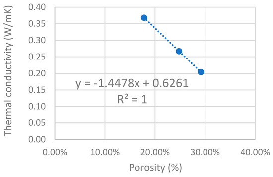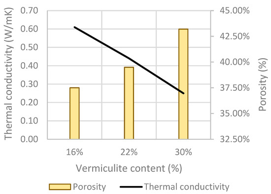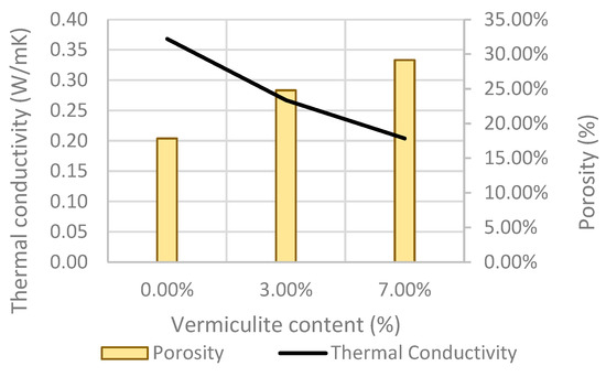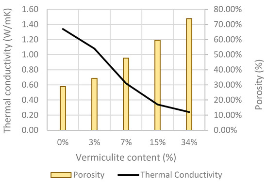 As can be seen in Figure 12, Palomar et al. (2015) [43] obtained a low thermal conductivity for the mortar without vermiculite (0.37 W/m·K); despite this, with the addition of vermiculite contents of 3% and 7%, the thermal conductivity reduced to 0.27 W/m·K and 0.20 W/m·K, respectively. This reduction had a strong correlation with the increase in porosity, as seen in Figure 13, and is defined by a first-degree function with a high coefficient of determination (R2 = 1).